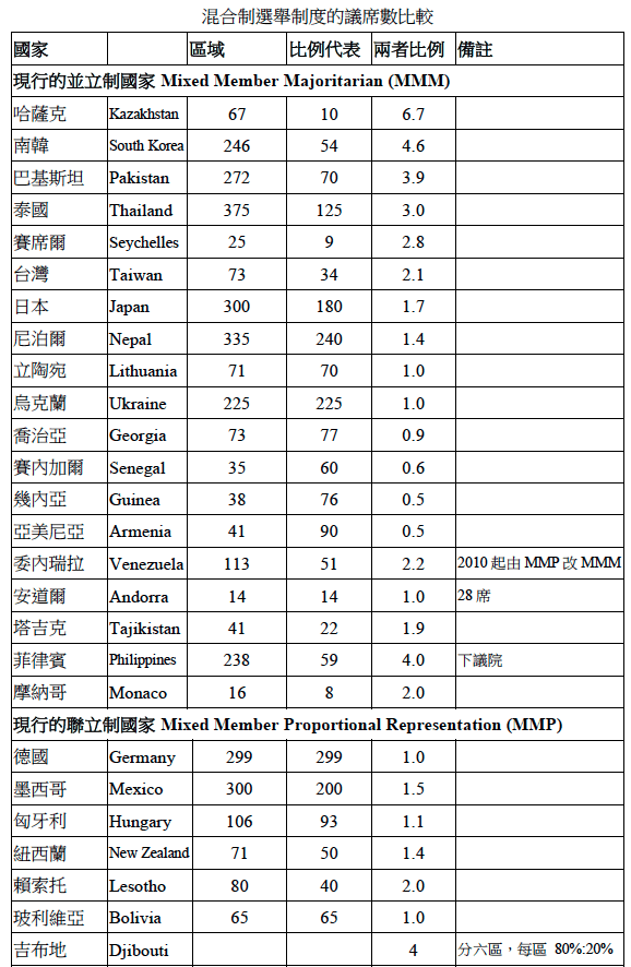 *混合制國家議席對照表(若需原檔請來信索取)。出處:菜市場政治學,作者陳方隅自行整理。兩院制國家以眾議院為主,議席數以製表時間(2015-11-30)的最近一次選舉為主。2018年2月更新國家清單。曾經使用過聯立制的國家另有:亞塞拜然、義大利、羅馬尼亞、保加利亞和克羅埃西亞等國。參考資料庫:IDEA.