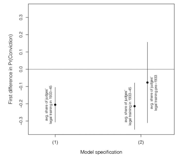 若我們對照圖一來看,在作者所估計的統計模型中,並假設其他條件不變,當法院中「法官於納粹時期接受法律教育的比例」從第 25 個百分點提高至第 75 個百分點時,被告因納粹罪行而遭定罪的機率,將顯著下降約 21 個百分點。整體而言,無論是以「是否由納粹政權任命」,或是以「是否在納粹時期接受法律訓練」來衡量法官背景,所得結論皆高度一致:法院中前納粹法官越多,納粹黨人的罪行就越難被定罪。