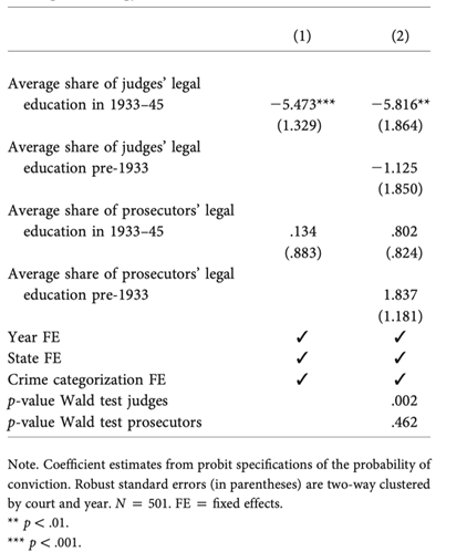 這篇文章透過兩種方式來測量法官跟納粹政權是否有關係:有多少法官在納粹體系下被任命、以及法院當中法官有多少比例是在納粹時期受過法律訓練。舉例來說,如表一所示:若法院當中法官「在納粹時期受法律教育的比例」越高,被告被定罪的機率就越低,而且這個效果比「是否由納粹任命」(見原文Table 1)更大、更穩定。